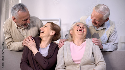 Cheerful old couples laughing and having fun together sitting home, friendship