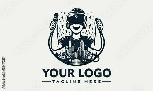 Cheerful person wearing a virtual reality headset and holding a game controller with abstract digital elements. Gaming and technology concept