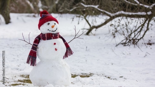 Cheerful snowman standing in a snowy field with a forest and mountain range in the background.