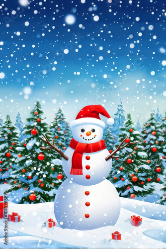 Cheerful snowman wearing a Santa hat and scarf in a snowy forest with decorated Christmas trees, festive atmosphere with falling snow. Generative AI
