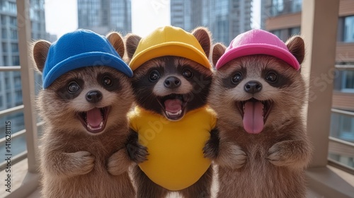 Cheerful trio of raccoon plush toys in colorful hard hats against urban backdrop evokes joy and whimsy offering a playful delightful scene