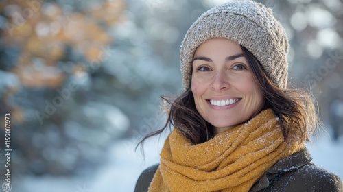 Cheerful woman bundled in scarf enjoying winter outdoors