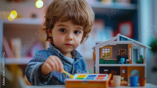 Cheerful Young Boy Plays with Miniature Dollhouse in Cozy Home Setting