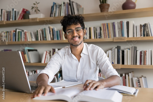 Cheerful young Indian college student man in eyeglasses sitting at table with heap of books in public library, preparing for university test, exam, looking at camera, smiling, posing for portrait