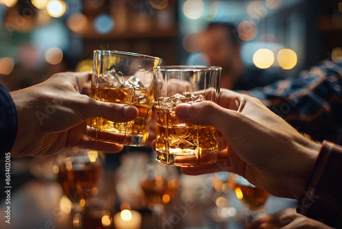 cheers glasses of whiskey in hands, for celebrating a friendly party or week ending in a bar or a restaurant.