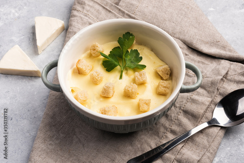 Cheese cream soup with croutons and parsley on gray marble stone table. Flat lay, top view and copy space for your text