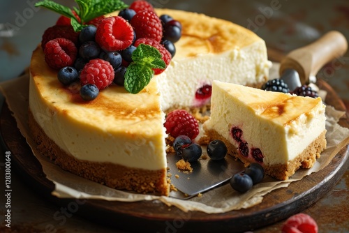 Cheesecake with Fresh Berries, Creamy and Smooth Cheesecake Topped with Raspberries, Blueberries, and Strawberries, Delicious Dessert Isolated on Background with Copy Space