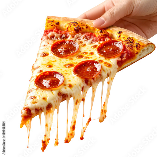 Cheesy Pepperoni Pizza Slice with Stretchy Mozzarella Pull, Isolated on Transparent Background