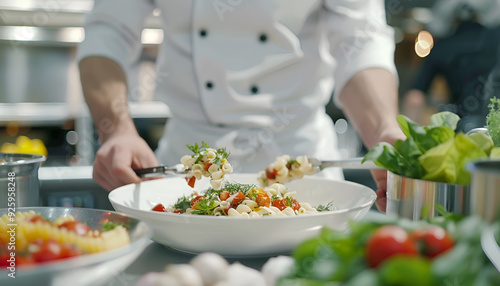 Chef hands preparing delicious cold pasta salad on the table closeup