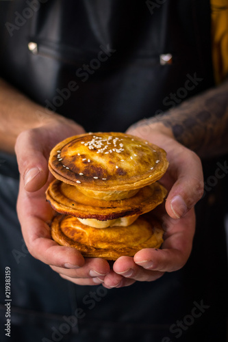 Chef man hands holds hot vegetable tart. Yummy crispy veggie closed tart with mushrooms, cabbage and pumpkin inside. Fast food and takeaway concept. Hipster street food. Crusty snack and lunch