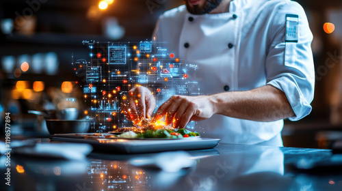 chef preparing gourmet dish with digital technology overlay, showcasing innovation in cooking. vibrant colors and modern kitchen create inspiring culinary atmosphere