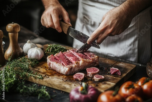 Chef slicing a raw steak on a wooden board with herbs and vegetables.