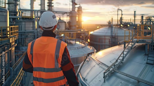 Chemical engineer in a lab coat and safety glasses, using a microscope to examine chemical compounds