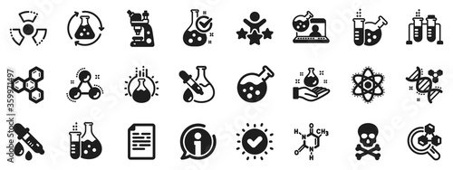 Chemical formula, Microscope and Medical analysis. Chemistry lab icons. Laboratory test flask, reaction tube, chemistry lab icons. Microscopic research, toxic radiation. Vector