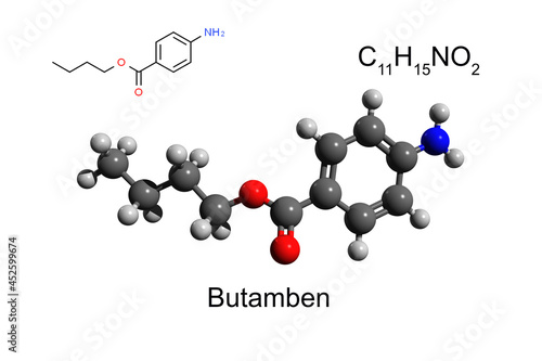 Chemical formula, skeletal formula and 3D ball-and-stick model of local anesthetic butamben, white background