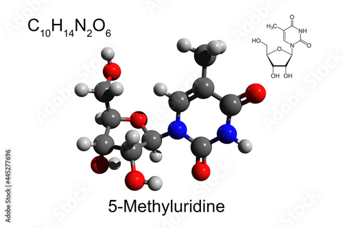 Chemical formula, skeletal formula, and 3D ball-and-stick model of nucleoside 5-methyluridine, white background