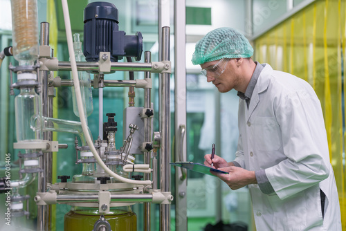 Chemical scientist male writing result CBD oil extraction in paper board during rotational vaporizer machine in process at cannabis farm laboratory.