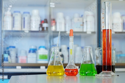 Chemical tube set development and pharmacy in laboratory with multicolored substances in laboratory - Image
