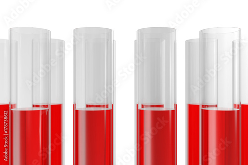 Chemistry flasks with colored liquid on white background background. Science chemistry concept. Laboratory test tubes and flasks with colored liquids, 3D rendering