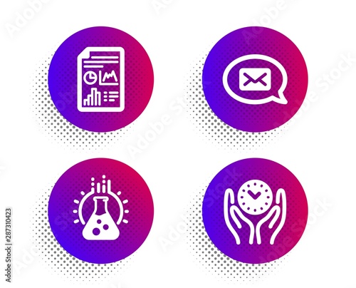 Chemistry lab, Report document and Messenger icons simple set. Halftone dots button. Safe time sign. Laboratory, Growth chart, New message. Management. Education set. Vector