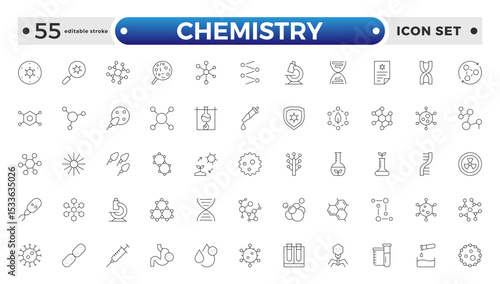 Chemistry outline icon set. Containing beaker, experiment, microscope, test tube, laboratory, molecule, and more. Line vector icons collection. Editable stroke outline icon.