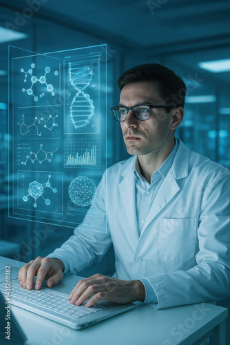 Chercheur en blouse blanche analysant des données biologiques complexes via une interface numérique — intelligence artificielle et recherche médicale avancée