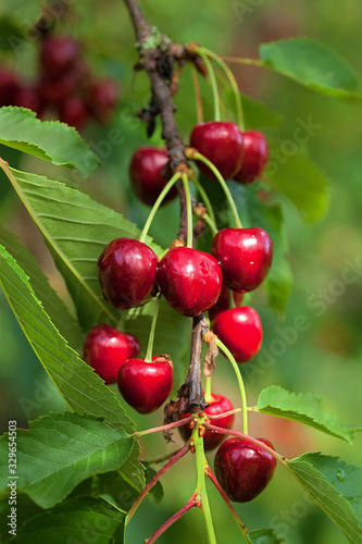 Cherries on branch in summer morning with dew drops. Cherry branch in orchard. Detail on group of cherries on twig. Bunch of wild cherries on tree in garden. Ripe bigaroons on tree.