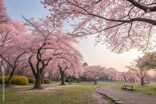 Cherry Blossom Trees in Full Bloom at Sunrise in Beautiful Park Setting with Pathway
