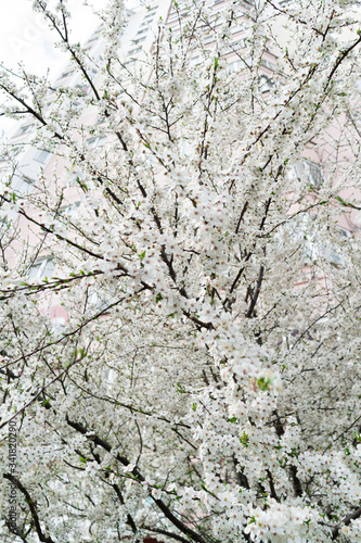 Cherry blossoms. Very beautiful floral background. Background of flowering trees. Spring landscape. Floral background. Spring background. Cherry blossoms in the spring on the street.