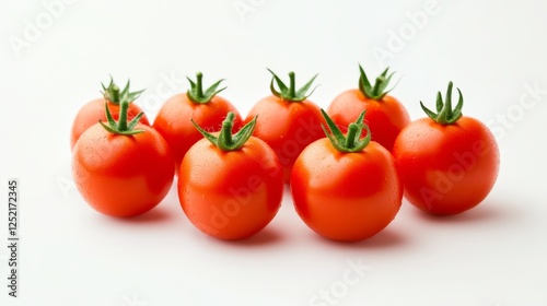 Cherry tomatoes arranged in a row on a white background, freshness and organic produce concept