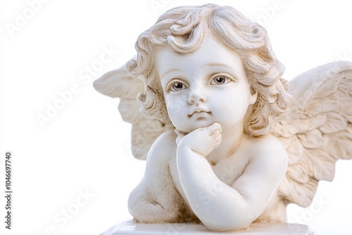Cherub Angel Statue with Hand on Chin, Isolated on White Background, High Resolution