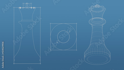 Chess 3d blueprint mesh model on a blue background. Front view orthographic and perspective free style render, 3d rendering