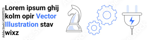 Chess knight for strategy, gears for efficiency and process, electric plug for innovation and energy, text for communication. Ideal for business, strategy, energy, innovation, process workflow