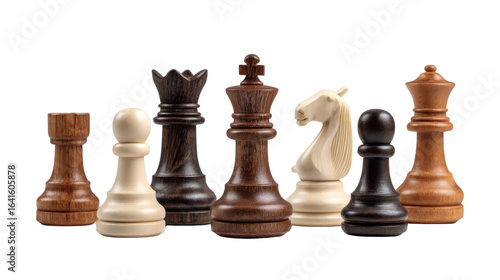 Chess pieces: Intricately carved chess pieces stand in a line, symbolizing the strategy and artistry of the game. The pieces, each distinct in shape and purpose, sit in a harmonious arrangement.