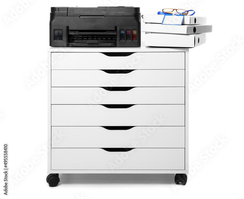 Chest of drawers with printer, stack of folders and blank badge on white background