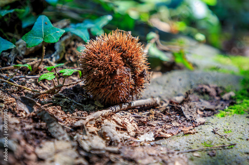 Chestnut shell on the ground with the background out of focus. Forest fruits concept