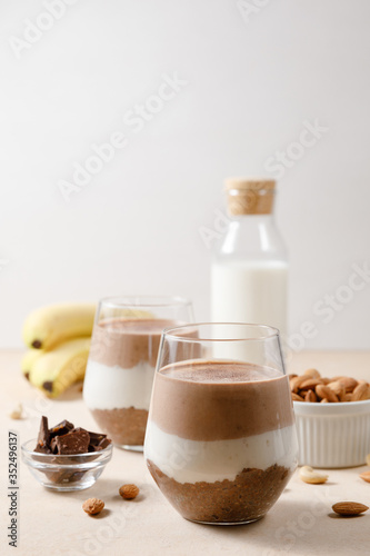 Chia seeds pudding with chocolate and banana smoothie in a glass on beige background