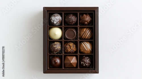 Chic and modern chocolate box filled with premium chocolates and pastry items, elegantly styled on a plain white backdrop.