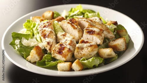 Chicken Caesar salad with croutons and dressing.