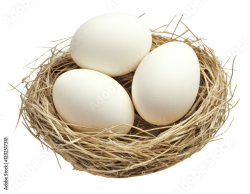 Chicken eggs in a straw nest. Eggs from organically farmed chickens isolated on white and transparent background