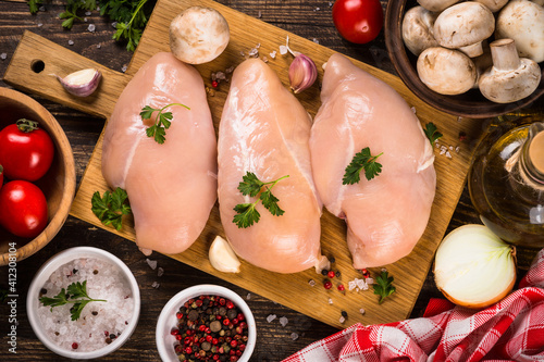 Chicken fillet with spices and vegetables on dark wooden kitchen table. Top view image.
