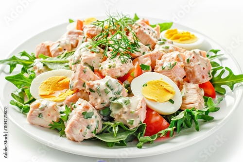 Chicken Mayonnaise Salad with Sliced Poultry Meat, Quail Eggs, Greens, Olivier Salat with Sliced Meat