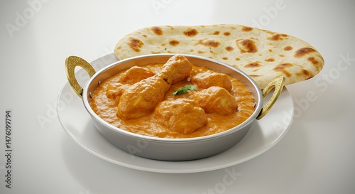 Chicken Tikka Masala in Silver Bowl with Golden Handles and Naan Bread