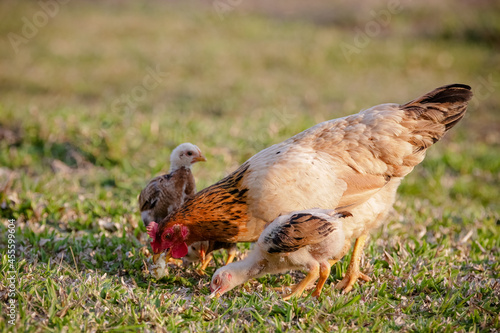 Chickens eating bush of various types and sizes on the grass in the field.