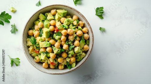 Chickpea avocado salad in a bowl, top view with fresh parsley and copy space on a white background