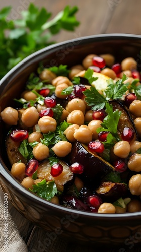Chickpea salad with roasted eggplant, pomegranate, and lemon dressing.