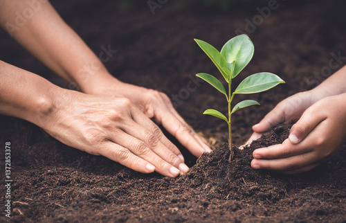 Child and parent hand planting young tree on black soil together as save world concept in vintage color tone