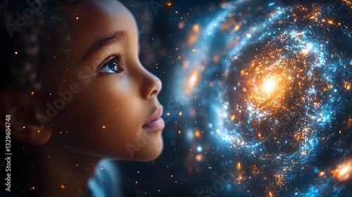 Child at Digital Telescope Hologram of Boundless Galaxy Filled with Passion for Astronomy and Dreams