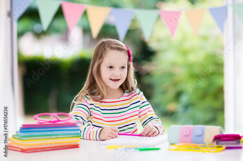 Child doing homework for school. Kids learn and paint.