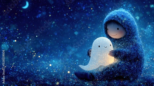 Child embraces gentle ghost under moonlight enchanted night scene fantasy magical atmosphere whimsical perspective
